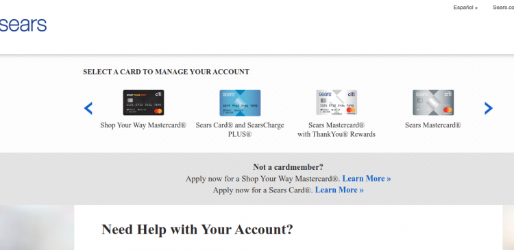 - Go to the Sears Credit Card website at www.searscard.com and click on your card below ‘SELECT A CARD TO MANAGE YOUR ACCOUNT’.